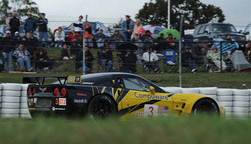 Zur GT2-Action. Hier wurde den Zuschauern ein packendes Rennen geboten in dem sich gleich 3 Marken, BMW, Corvette und Ferrari ein packendes Rennen um den Sieg lieferten. Keine Rolle an der Spitze spielte für dieses Mal Porsche. Farnbacher-Loles sicherte sich einen vierten Platz nachdem Dirk Werner den Wagen noch im morgendlichen Warmup unsanft in die Streckenbegrenzungen abgelegt hatte und feierte damit einen bescheidenen Erfolg. Pat Long im Meisterschaftsführenden Flying Lizzard Porsche kollidierte in der Anfangsphase unsanft mit dem BMW von Tom Millner.